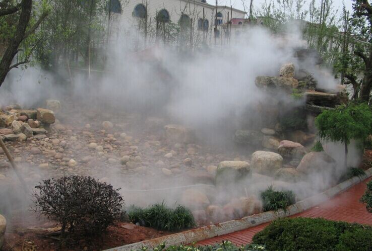 假山流水造霧系統(tǒng)的工作原理是利用特制的造霧機(jī)組,將水經(jīng)耐高壓管線由專業(yè)噴頭產(chǎn)生115微米(0001mm)的水滴,由此激發(fā)成的霧滴能長(zhǎng)時(shí)間懸浮、漂浮在空氣中,單一噴頭產(chǎn)生的霧長(zhǎng)可達(dá)35m。使用噴霧系統(tǒng)時(shí),其目的在使噴霧系統(tǒng)制造之霧顆粒,在未接到地面之前就能夠蒸發(fā),能達(dá)到此目的之方法是將霧顆粒變?yōu)橛庑∮?,霧顆粒逾小,就霧顆粒數(shù)量而言霧顆粒表面面積逾大,結(jié)果霧顆粒蒸發(fā)率逾高,蒸發(fā)冷卻效果就愈好;噴霧系統(tǒng)水壓逾高,噴霧的涵蓋面積逾大,擴(kuò)散效果愈好,霧顆粒逾小。因此噴霧系統(tǒng)產(chǎn)生的冷卻效果逾大,從而可以達(dá)到降溫、除塵、加濕、驅(qū)蟲(chóng)、清除異味、凈化空氣、美化環(huán)境等作用。