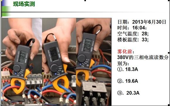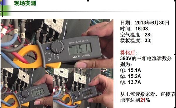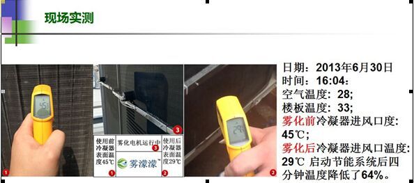 經(jīng)廣東福建兩省空調(diào)室外機安裝噴霧降溫系統(tǒng)試驗測試,機房專用空調(diào)室外冷凝壓力在炎熱夏季從原先的2324kgf/cm2降低至1819kgf/cm2,下降4-5kgf/cm2。既冷凝溫度從60℃降低至50℃達10度之多,根據(jù)上述概算公式,粗略推算出機組的節(jié)能效率約為20%。